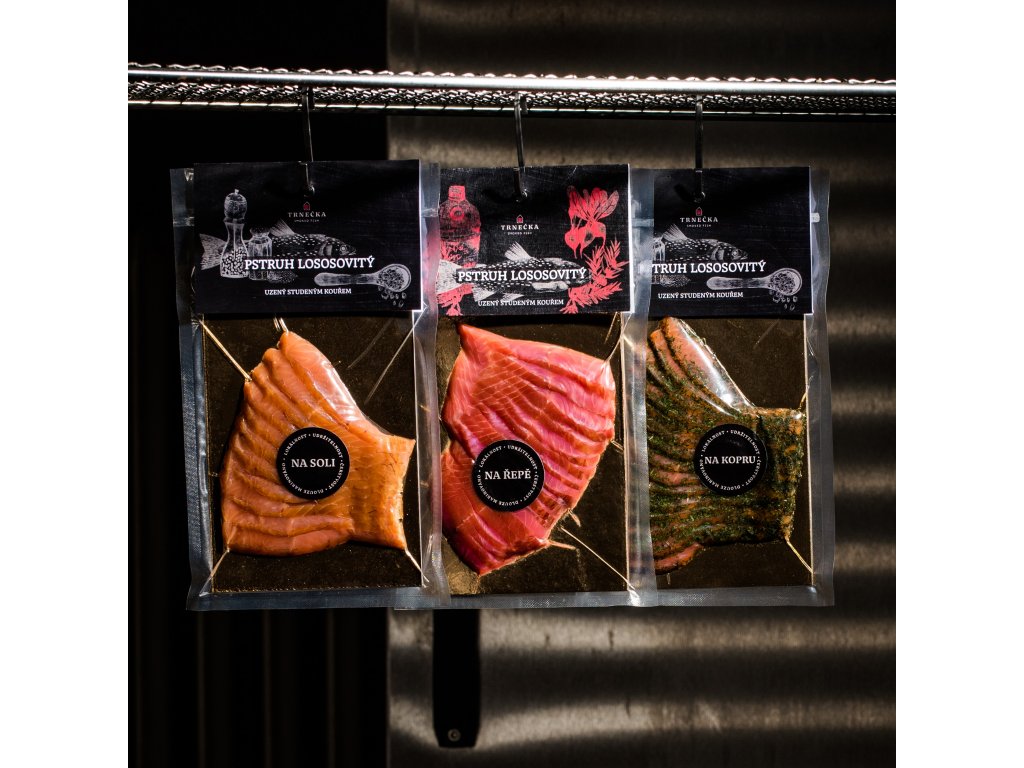- Pstruh uzený studeným kouřem (do 19°C) po dobu 48 hodin.