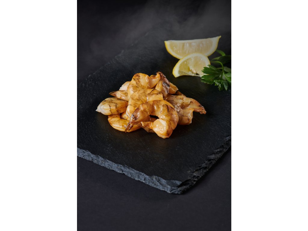 - Krevety jsou vyuzené, uvařené v páře a připravené k servírování.