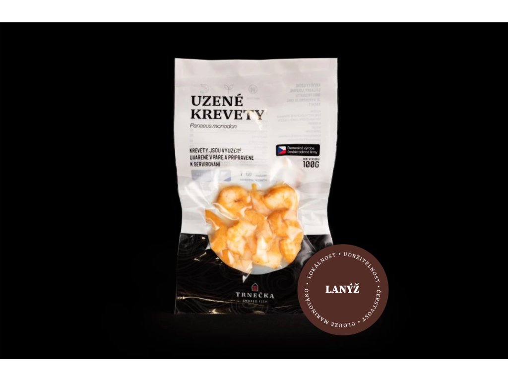 Tradiční středoevropská technika uzení. 100 g produktu bylo vyrobeno ze 160g krevet.